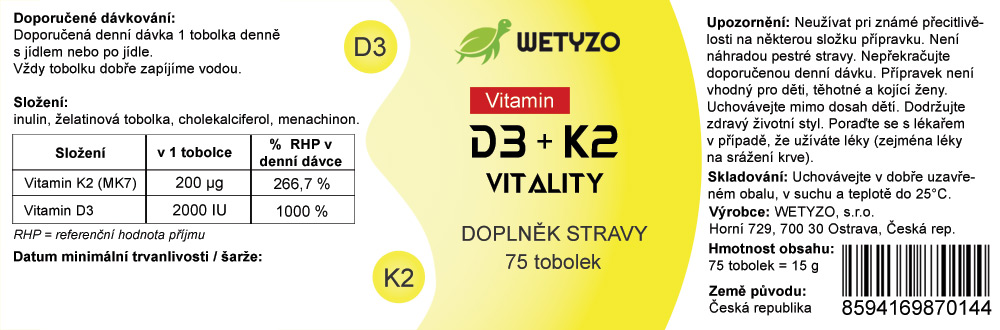 Vitamín K2 - (MK7) 200 μg (266,7% RHP), Vitamín D3 - 2000 IU (1000% RHP)