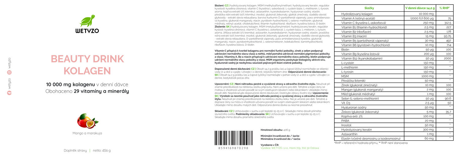 Jedná se o speciálně navržený beauty nápoj s obsahem 10.000 mg 100% bioaktivního hydrolyzovaného rybího a hovězího kolagenu, elastinu, kyseliny hyaluronové a vitamínu C s dalšími 27 účinnými látkami. Ty nám ve své vyvážené kombinaci přispívá k normální funkci pokožky, nehtů a vlasů.