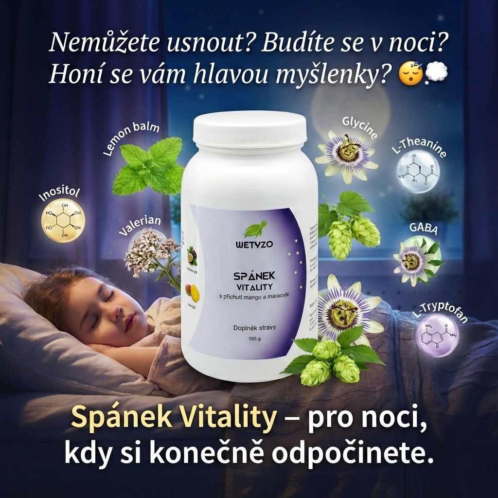 Spánek Vitality navíc obsahuje extrakty meduňky lékařské, kozlíku lékařského, chmele otáčivého, a mučenky pletní.