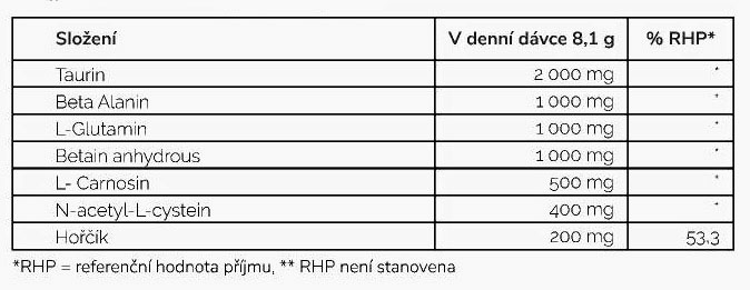 Složení: Taurine, Magnesium malate, Betain anhydrous, Beta Alanin, L-Glutamin, L-Carnosin, NAC (N-acetyl-L-cystein), regulátor kyselosti - kyselina jablečná, uhličitan hořečnatý, aroma, barvivo červená řepa, sladidlo steviol glykosidy - extrakt stevia rebaudina, sukralóza.