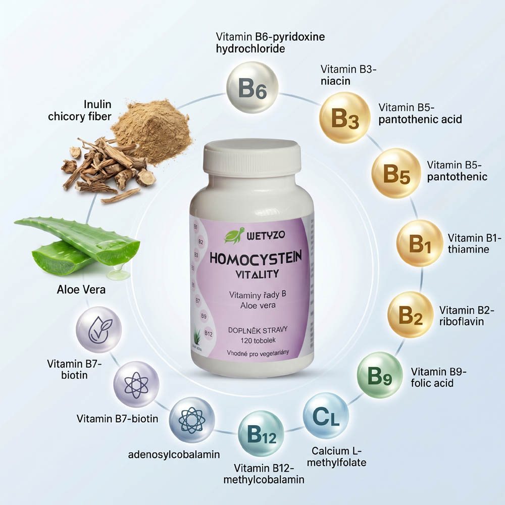 Vitamíny skupiny B jsou nezbytné pro celou řadu tělesných funkcí, zejména pro metabolismus a tvorbu energie. Přispívají také k udržení normálního metabolismu homocysteinu, který je součástí přirozených metabolických procesů v těle. Pro náš kardiovaskulární systém je nejlepší udržovat jeho hladinu v rovnováze. K správnému metabolismu homocysteinu přispívají vitamíny B6, B9 a B12.